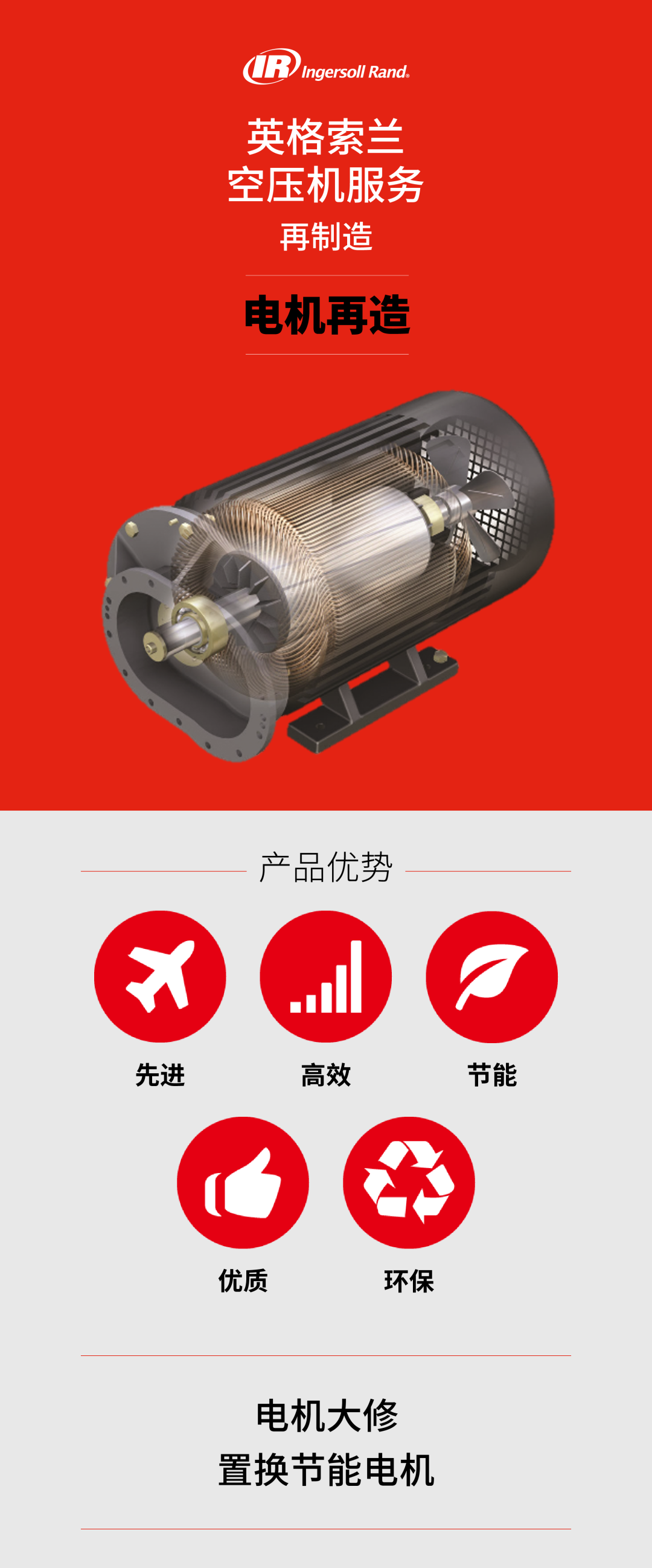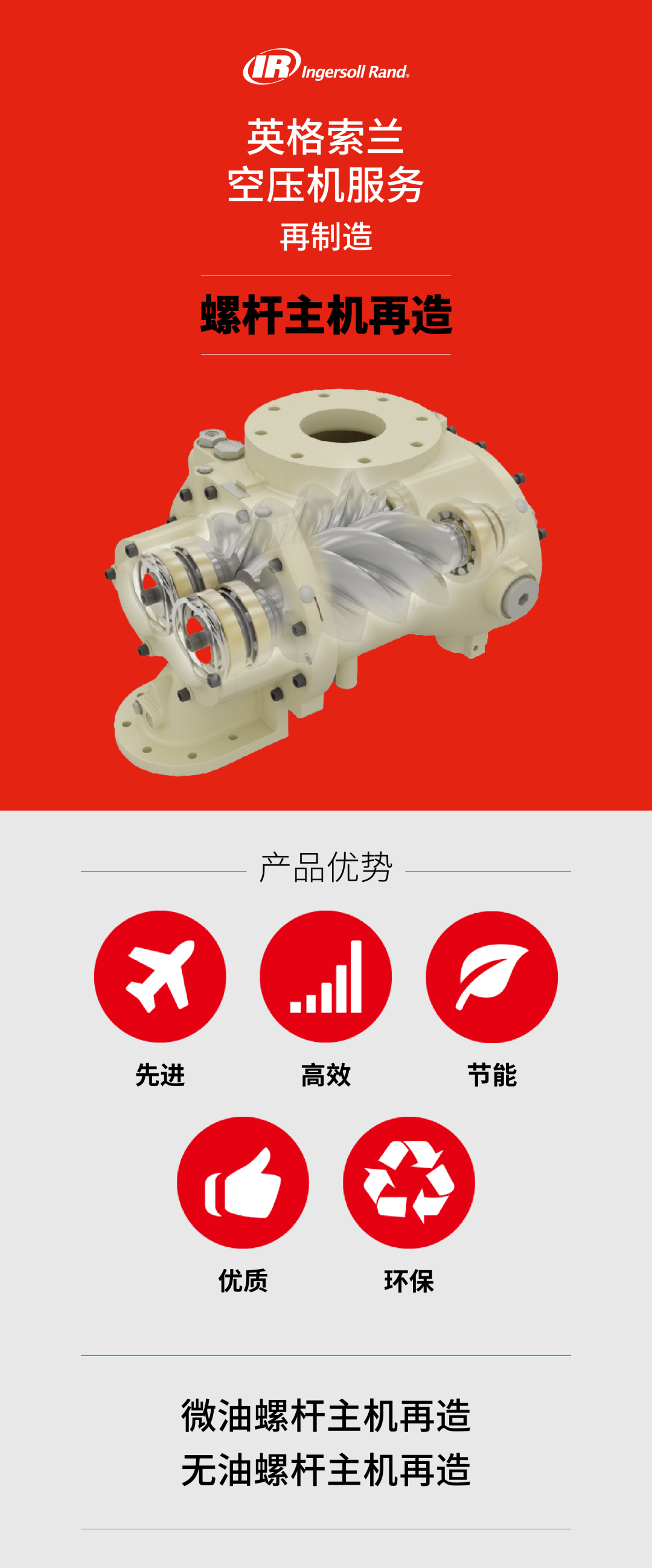 英格索兰再制造采用专业和定制化的工艺技术,在原有旧机组上进行一次新的制造,使其生命周期得以延续。实现节能环保等目标的同时,再造完成产品的性能和质量都不亚于新品。