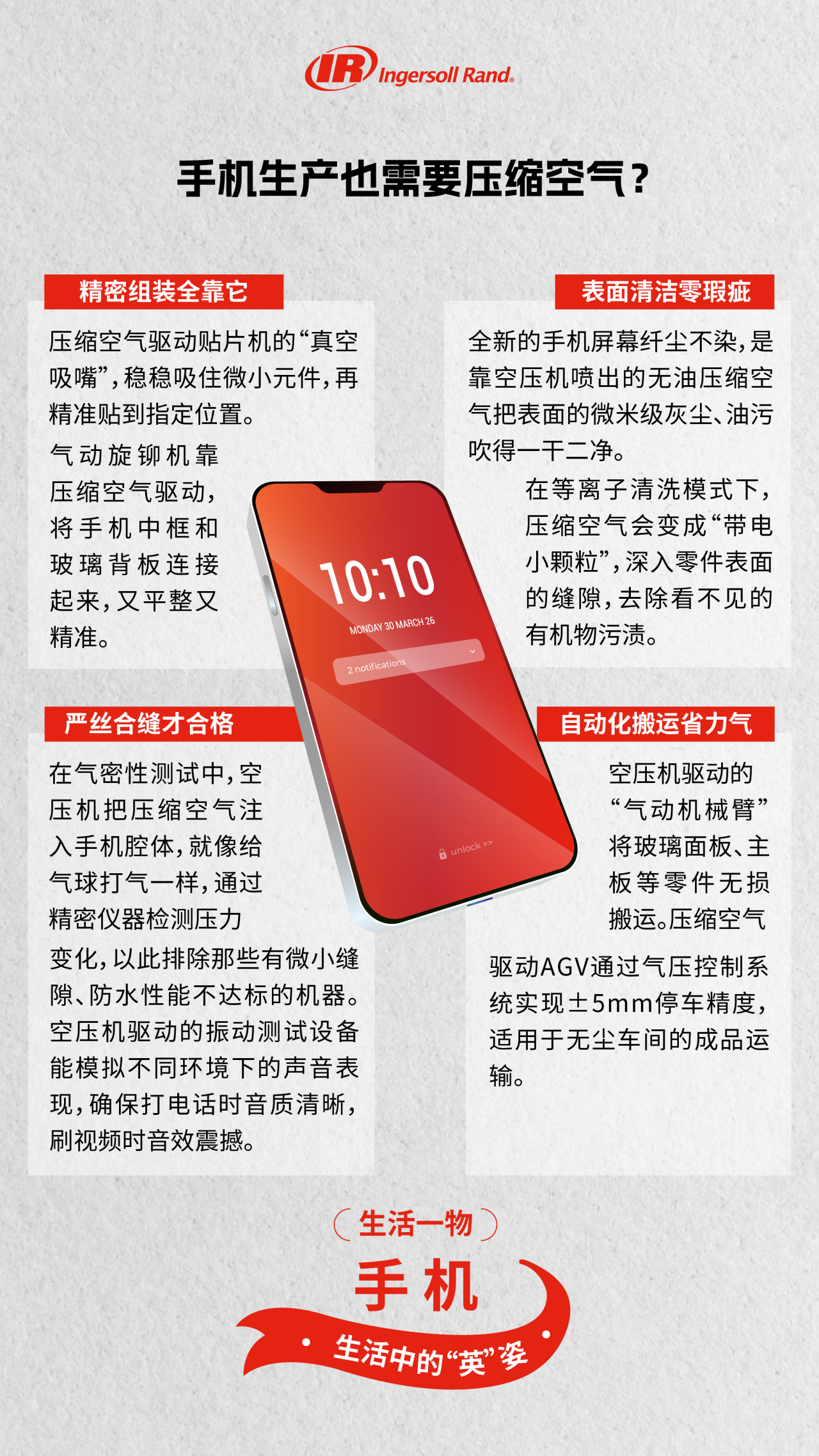 就可以想到空压机用看不见的压缩空气为手机生产的每一步提供稳定动力。
